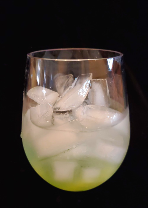 Muddle melon with syrup, then top with ice. Pour gin overtop, and splash in the melon liqueur. The recipe says “mix from the bottom” …but I don’t know what that means. So I just stirred it. Still pretty tasty.